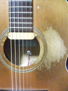 サウンドホールから見えるのはエアマイク。カホ無線かどっかで1000円くらいで購入した電子部品です。